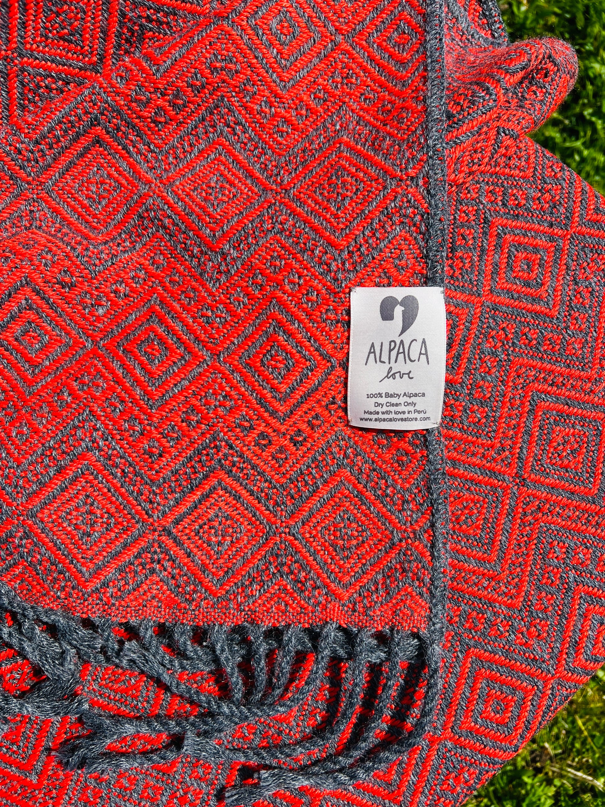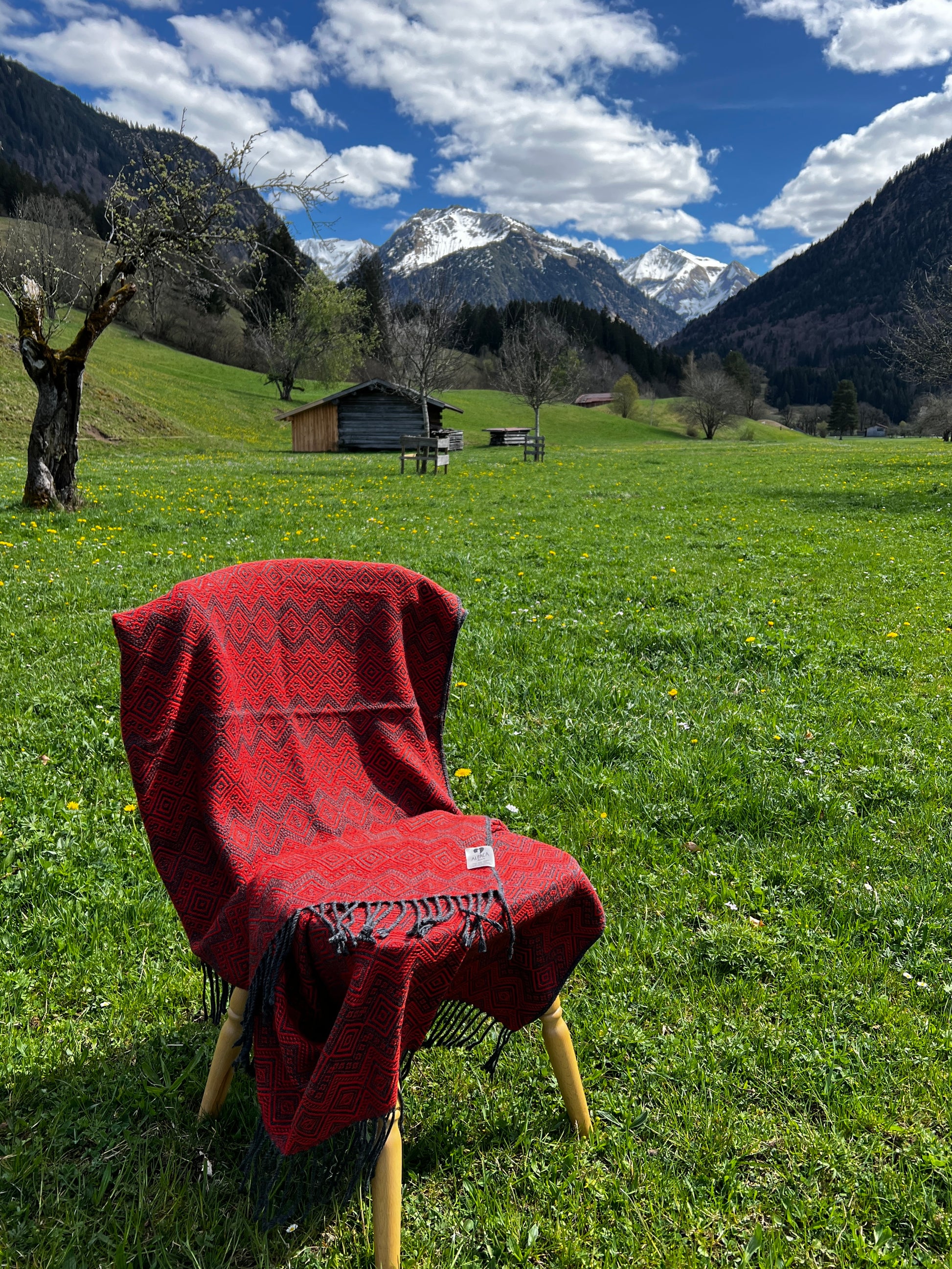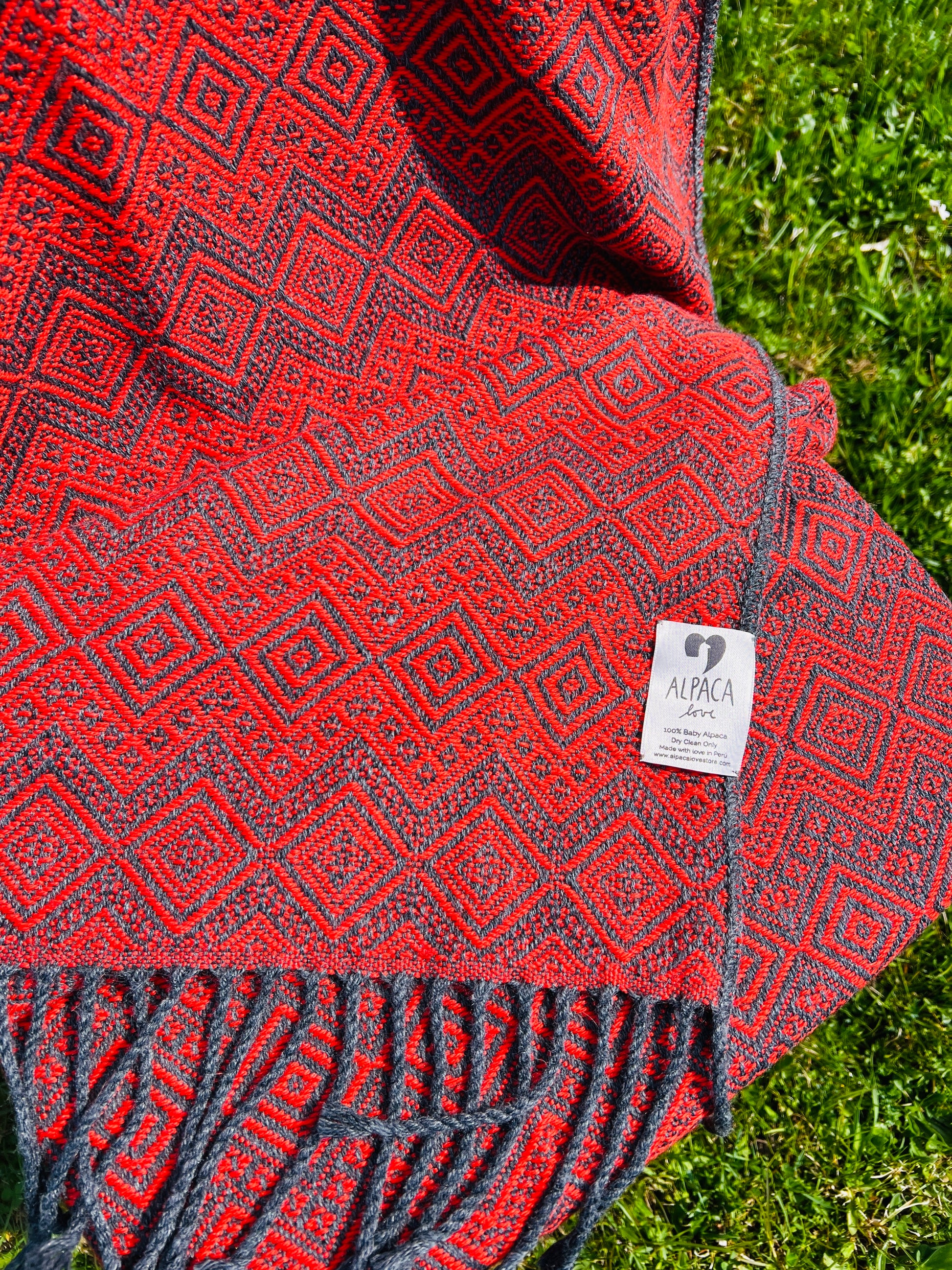 Abgebildet ist unsere wunderschöne Alpaka Decke in Anthrazit und rot aus 100% Baby Alpaka Wolle.