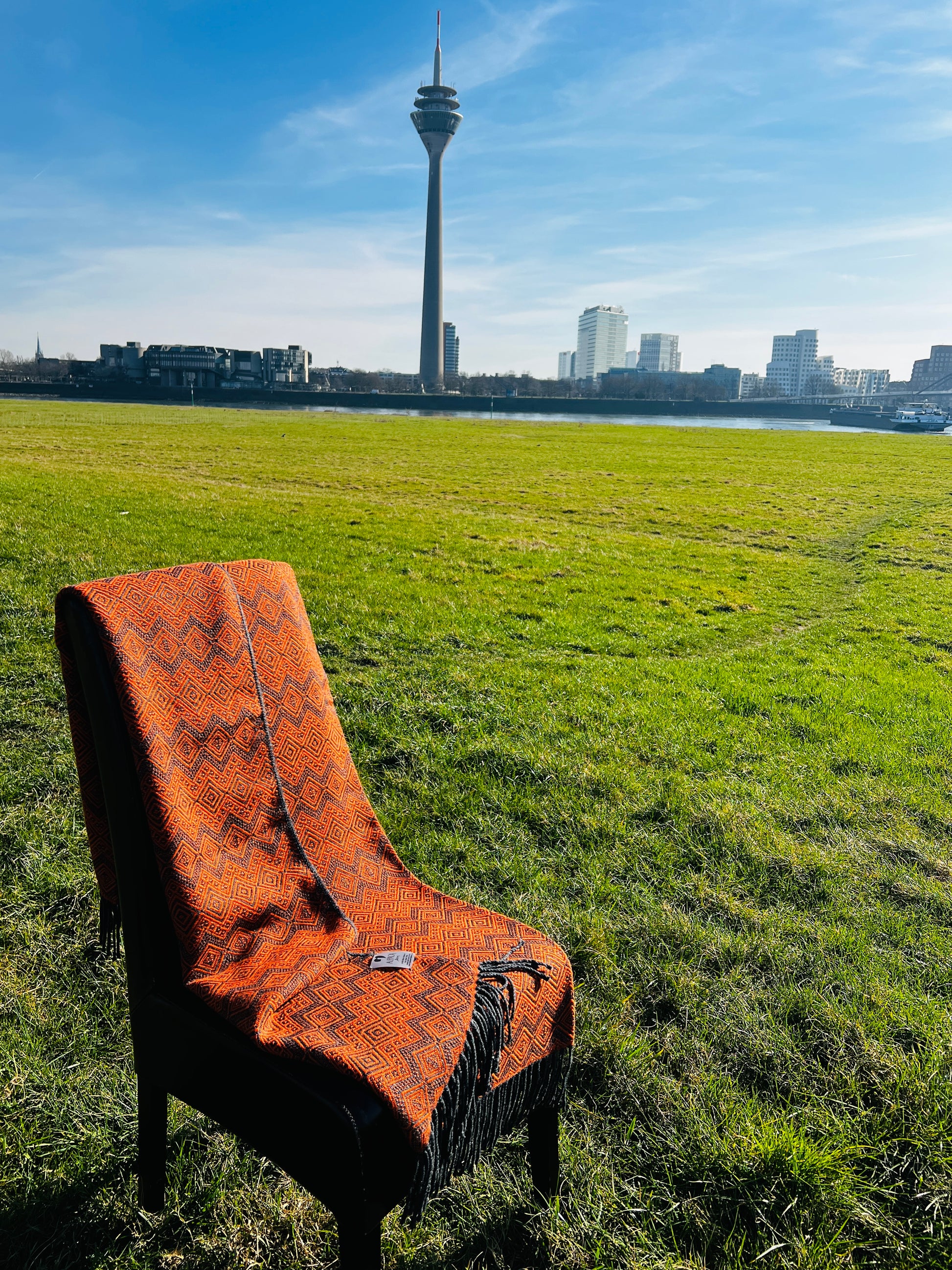 Abgebildet ist unsere wunderschöne Alpaka Decke in Anthrazit Orange aus 100% Baby Alpaka Wolle.