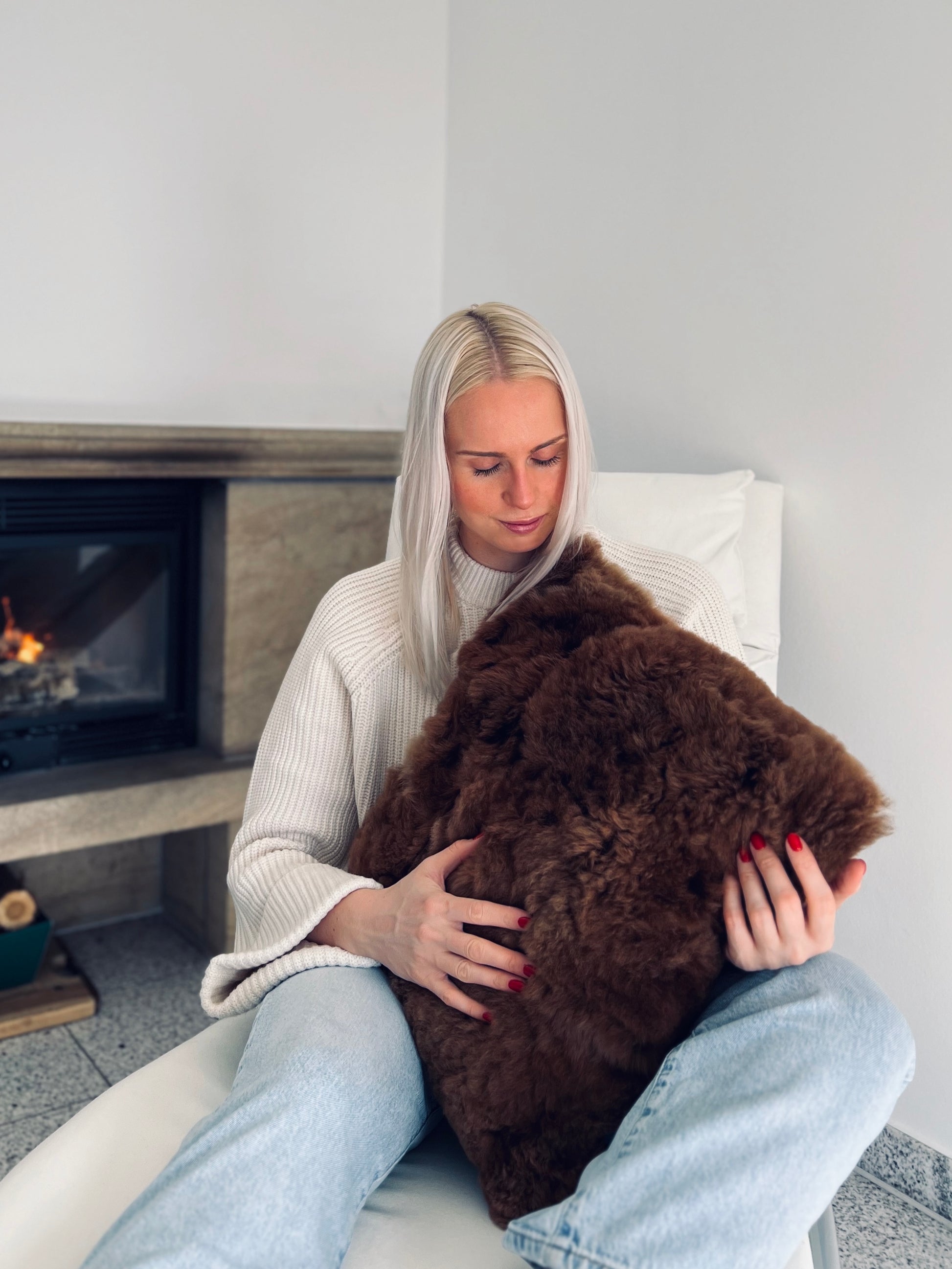 Wir präsentieren unser hochwertiges Kissen aus 100% Baby Alpaka Fell in der stylischen Farbe Braun.