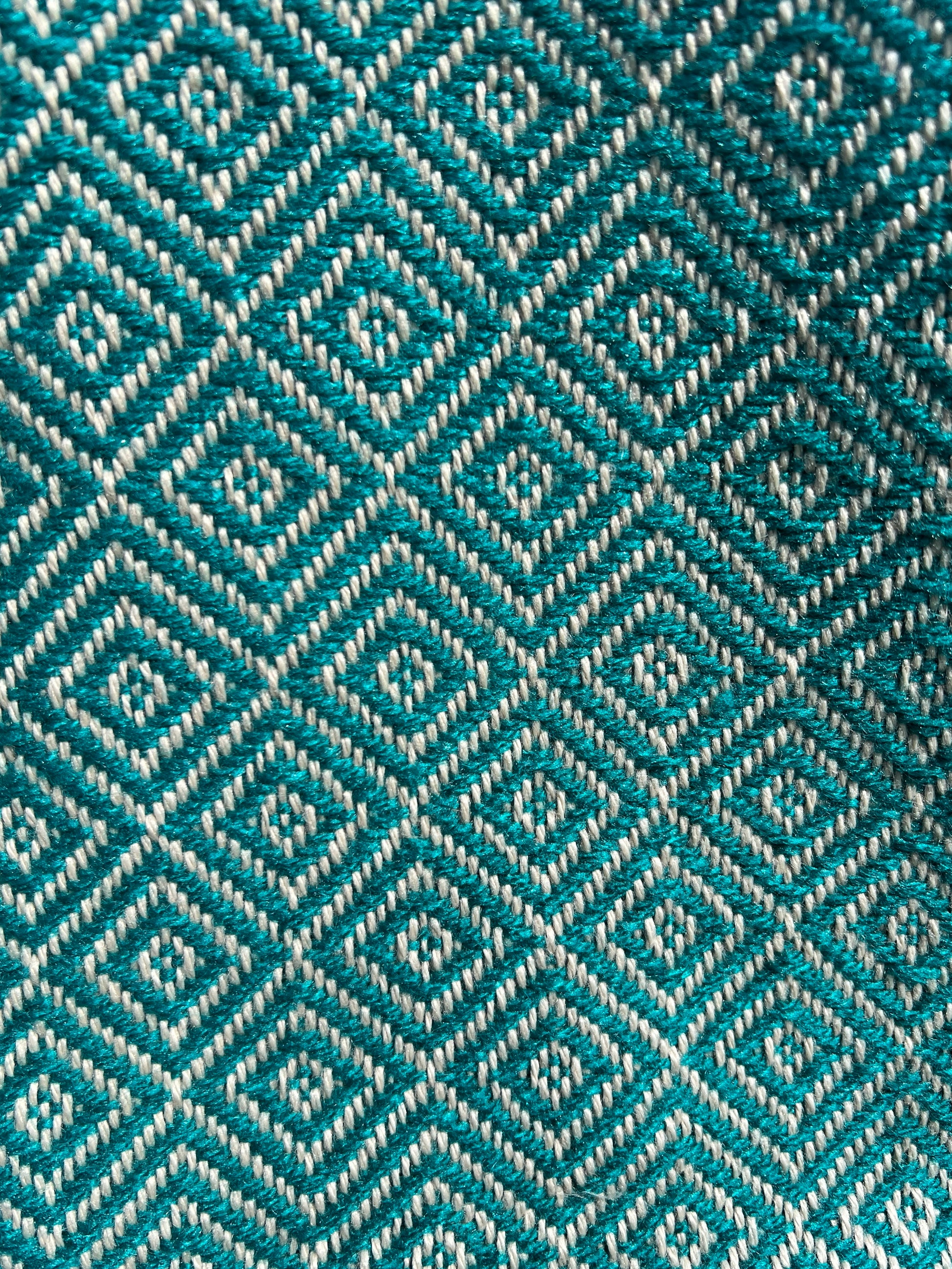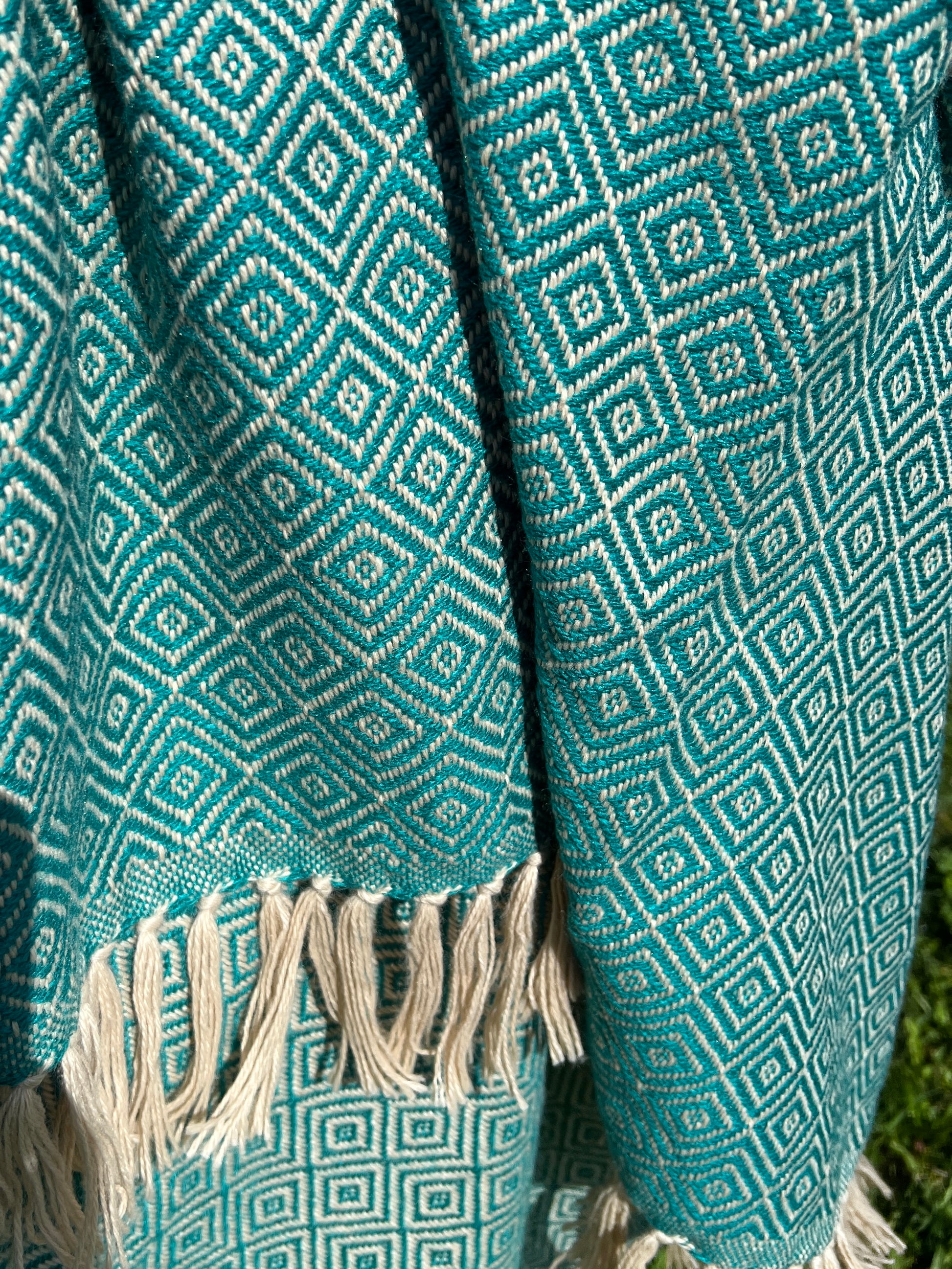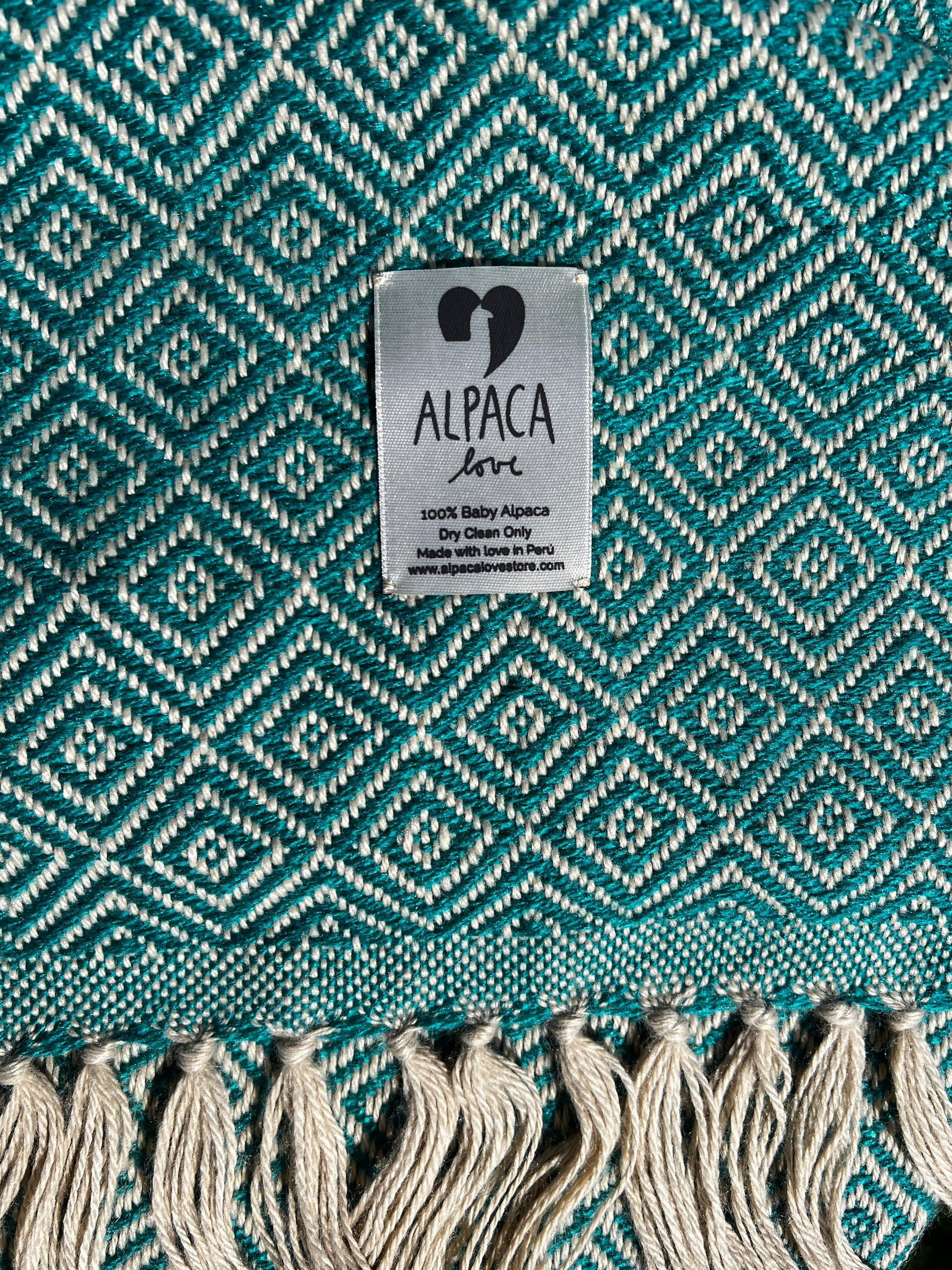 Abgebildet ist unsere wunderschöne Alpaka Decke in Smaragdgrün und beige aus 100% Baby Alpaka Wolle.