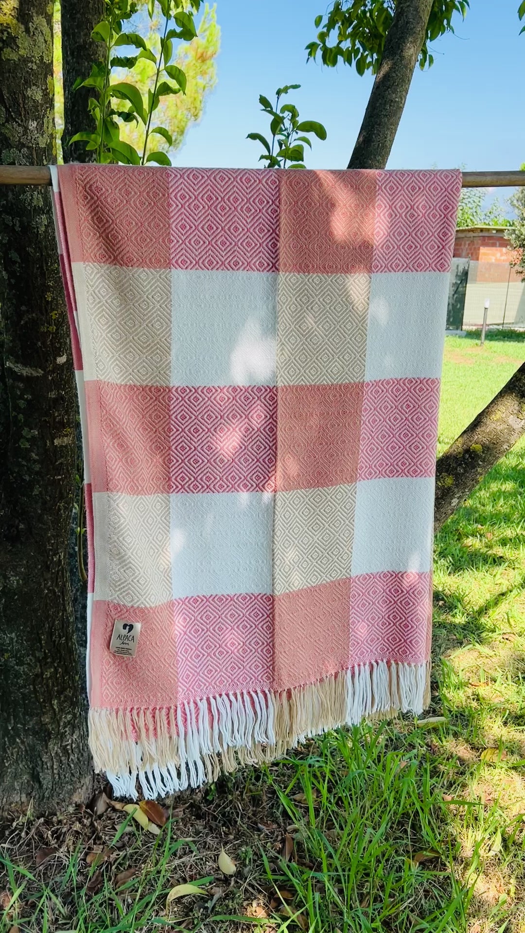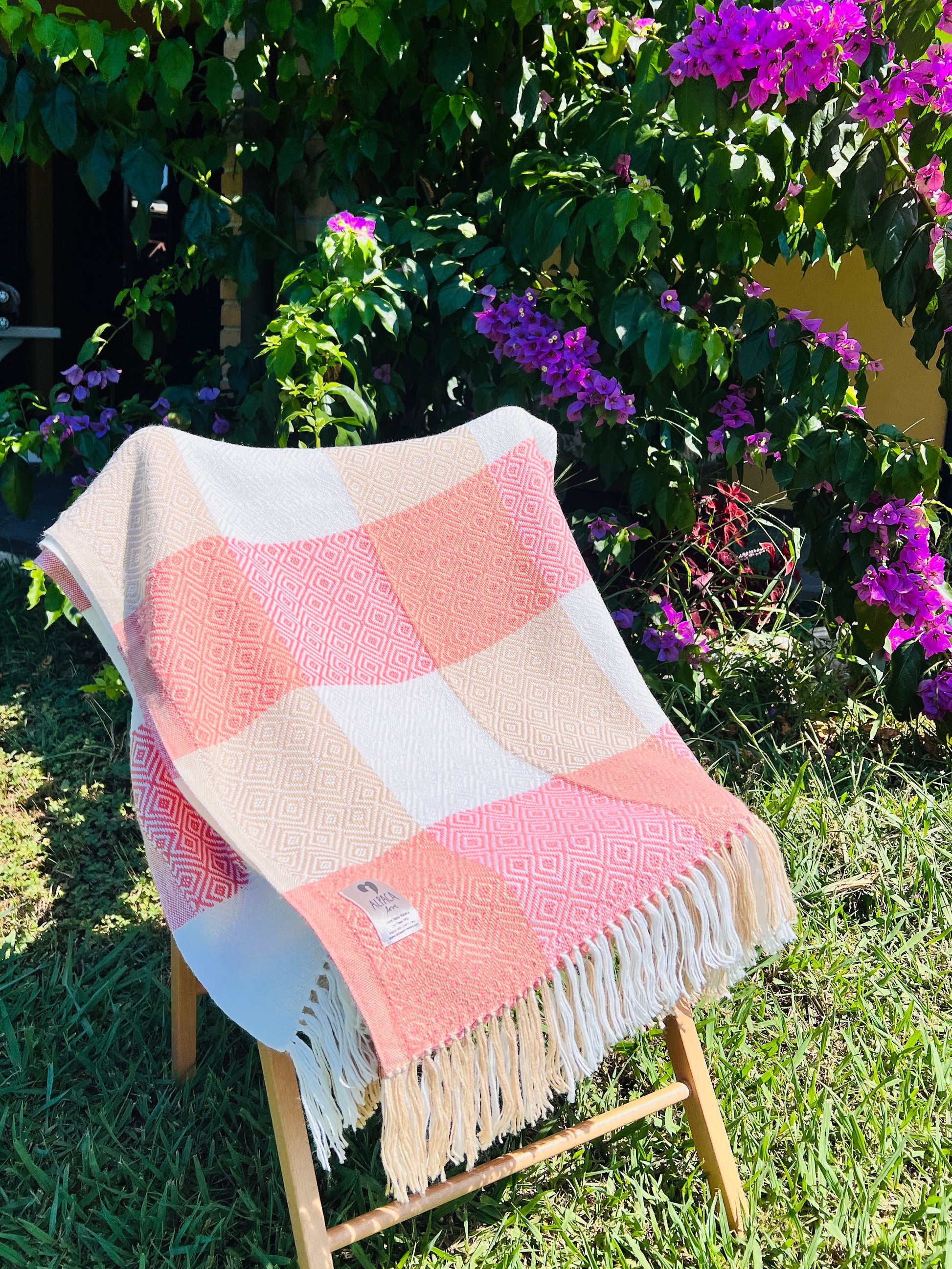 Abgebildet ist unsere wunderschöne Alpaka Decke in coral, weiß und beige aus 100% Baby Alpaka Wolle.