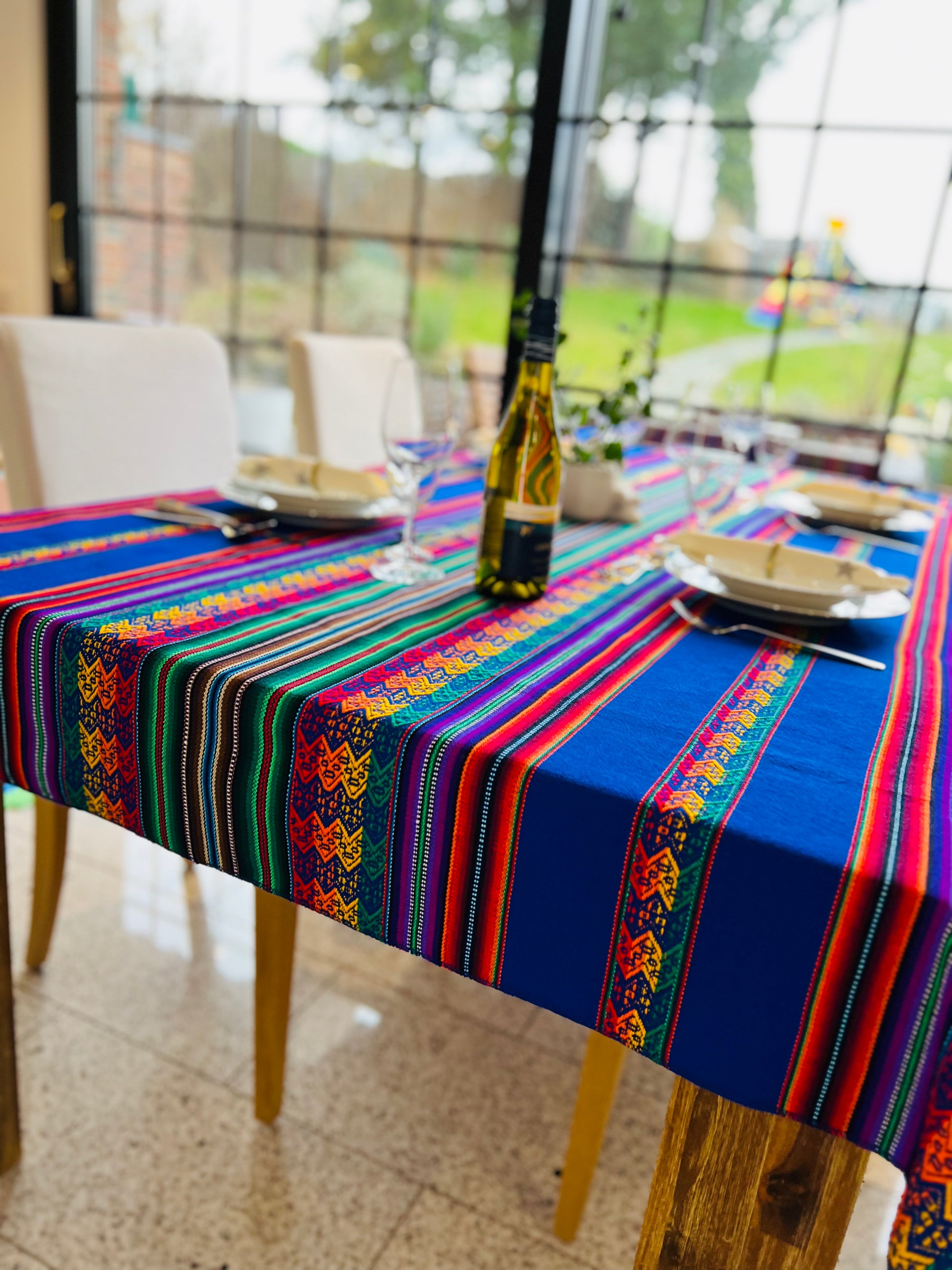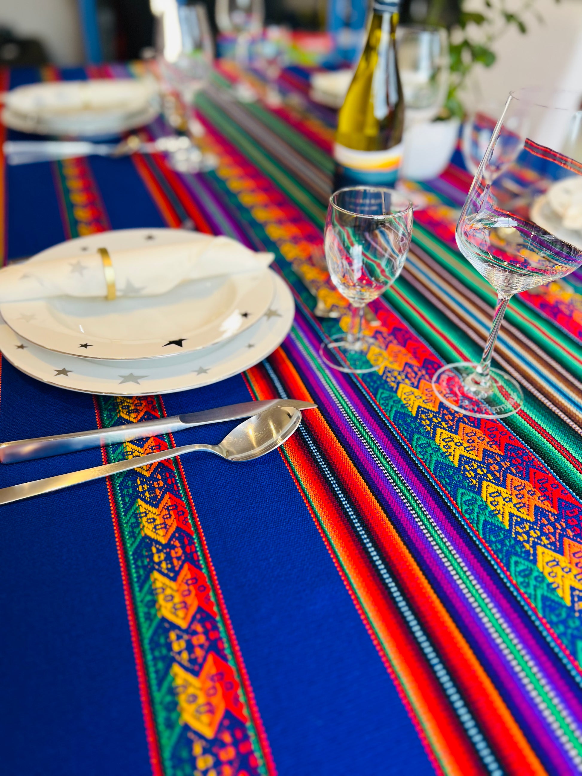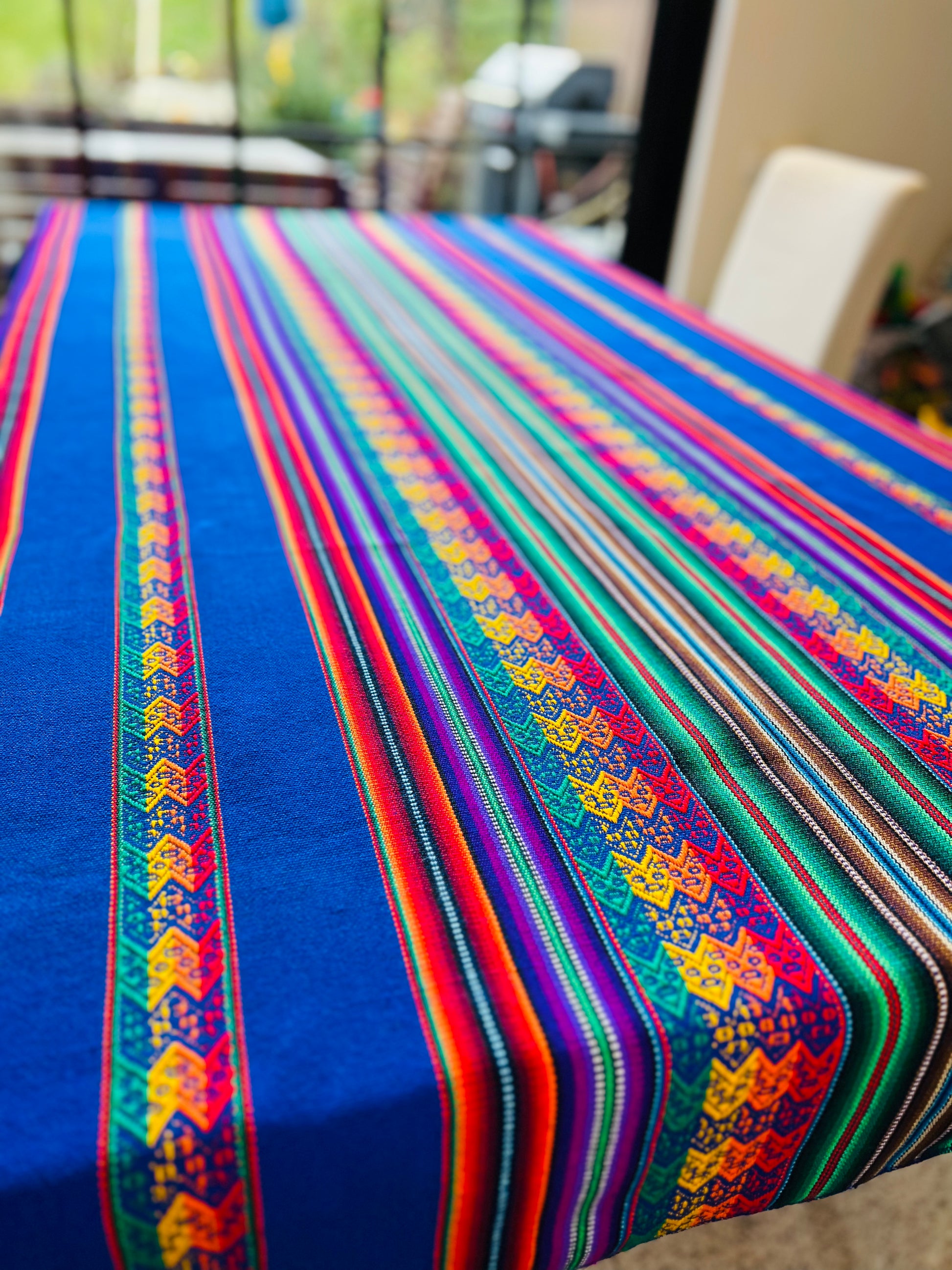 Ideal für ein Festmahl! Hier ist unsere wunderschöne farbenfrohe Tischdecke mit bunten Linienmustern. Die edle blaue Tischdecke wird Ihr Essbereich fröhlich hervorheben und ein Hingucker für Ihre Gäste sein.
