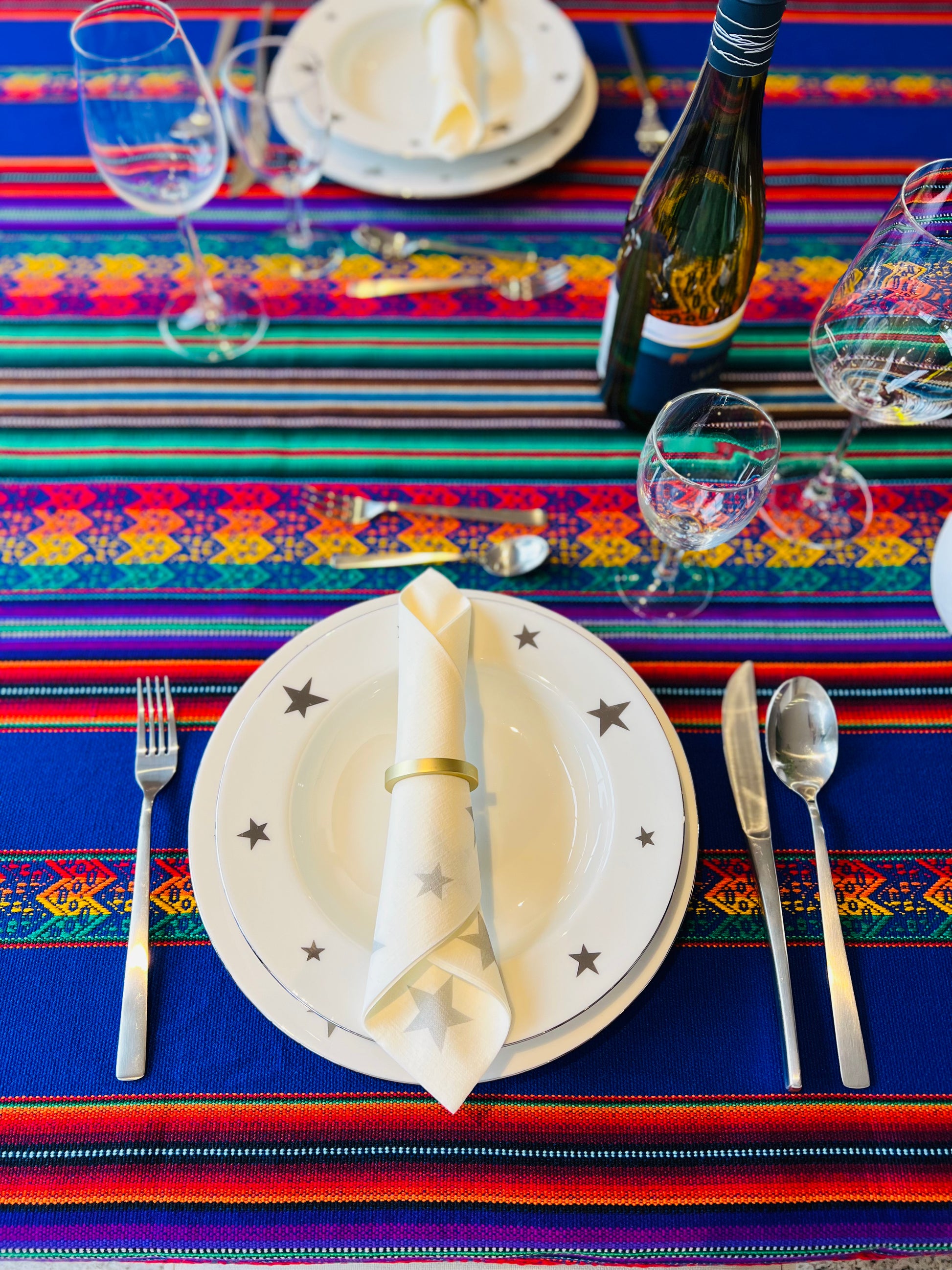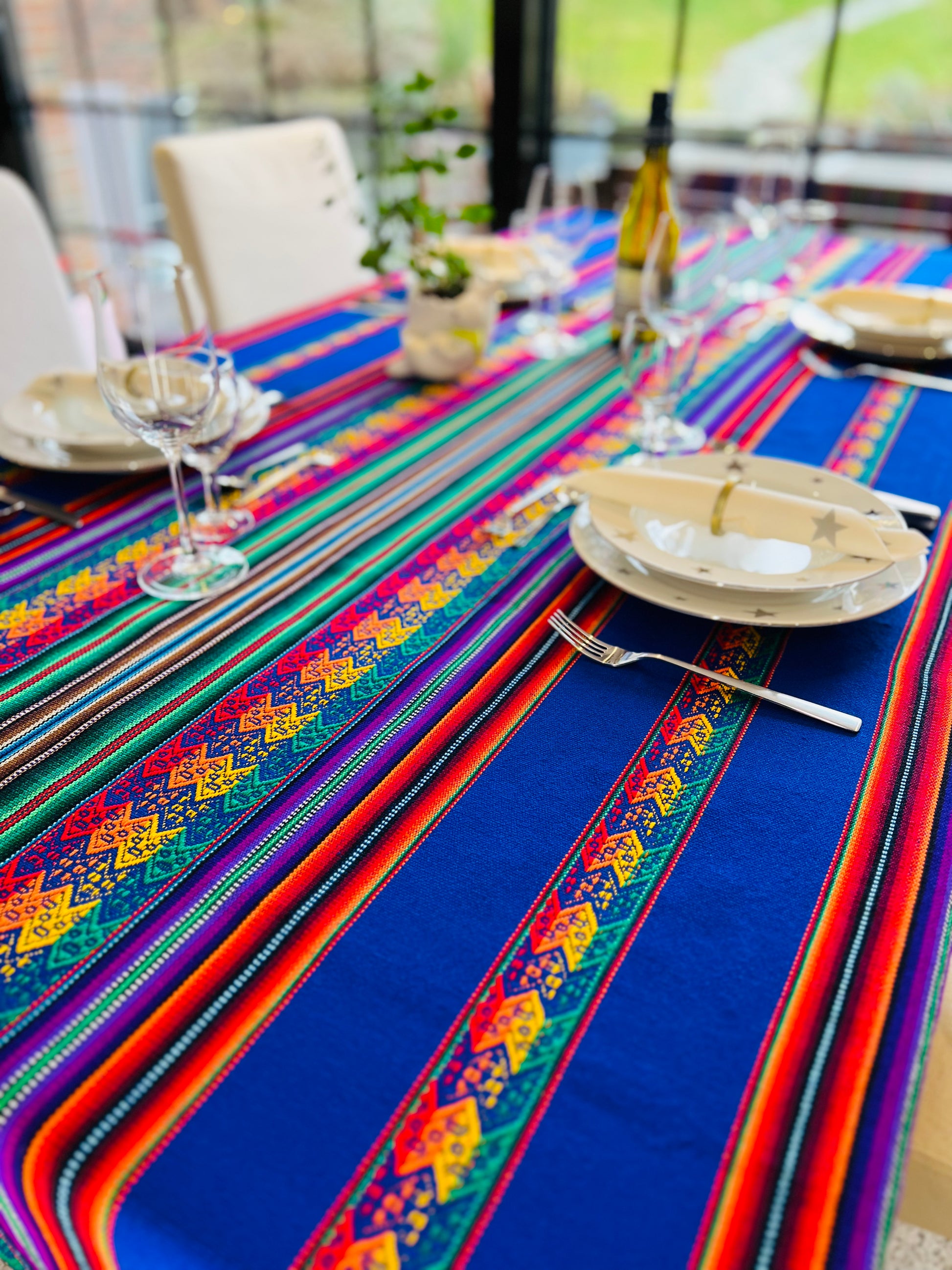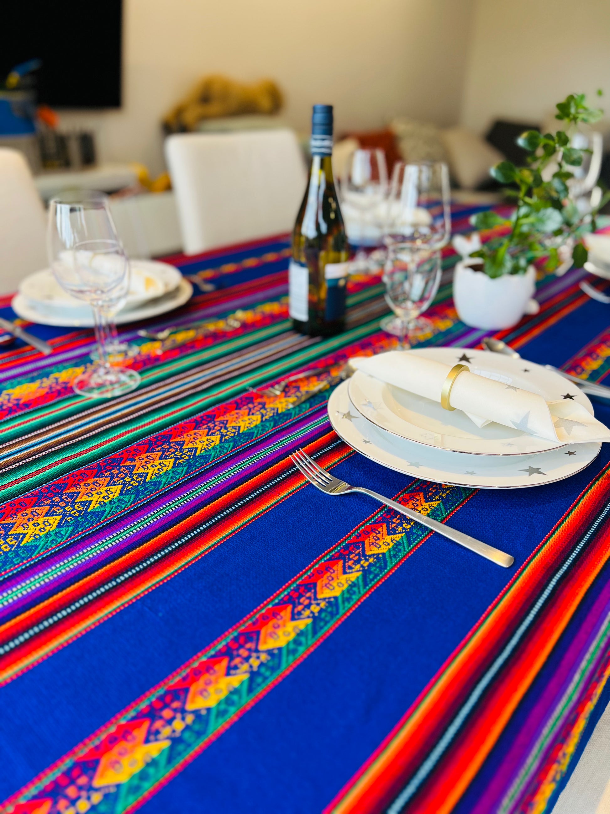 Ideal für ein Festmahl! Hier ist unsere wunderschöne farbenfrohe Tischdecke mit bunten Linienmustern. Die edle blaue Tischdecke wird Ihr Essbereich fröhlich hervorheben und ein Hingucker für Ihre Gäste sein.