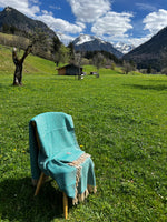 Abgebildet ist unsere wunderschöne Alpaka Decke in Smaragdgrün und beige aus 100% Baby Alpaka Wolle.