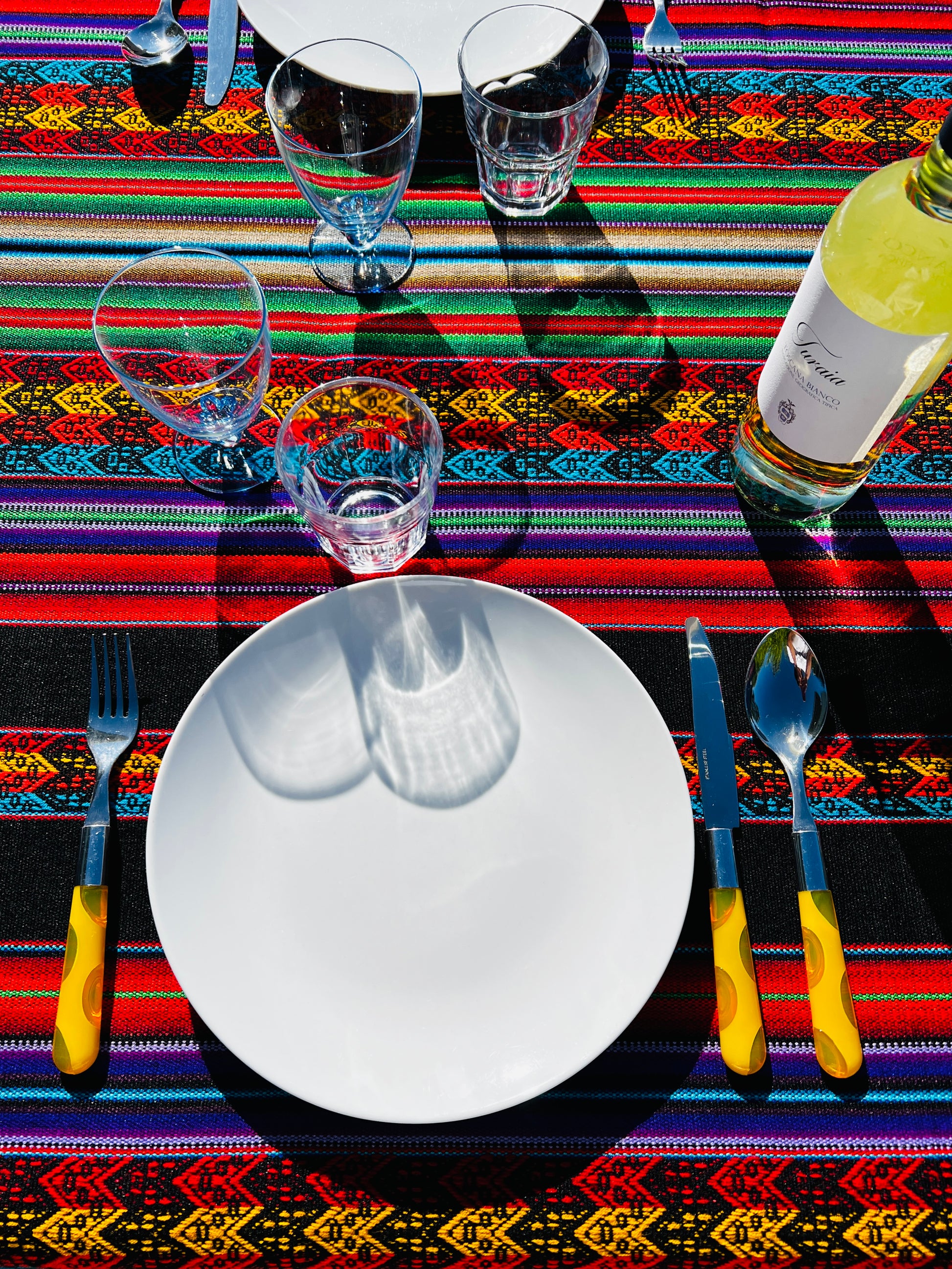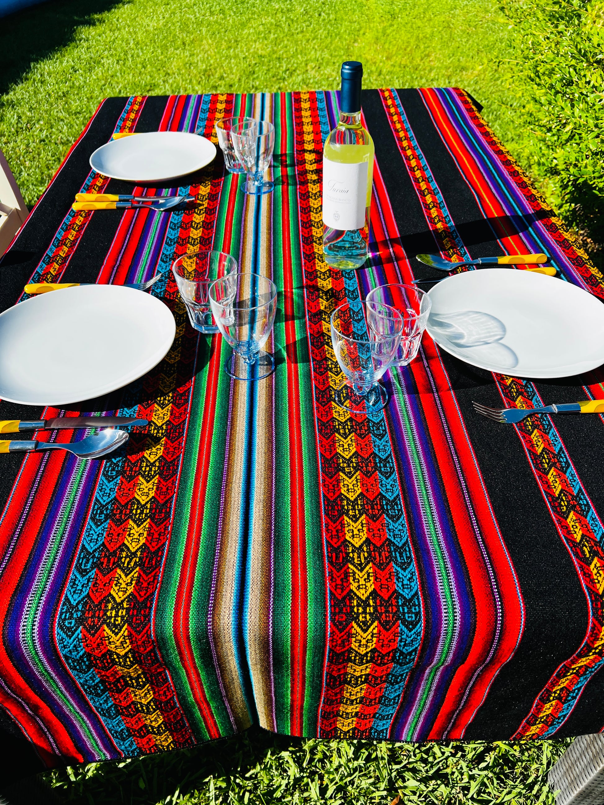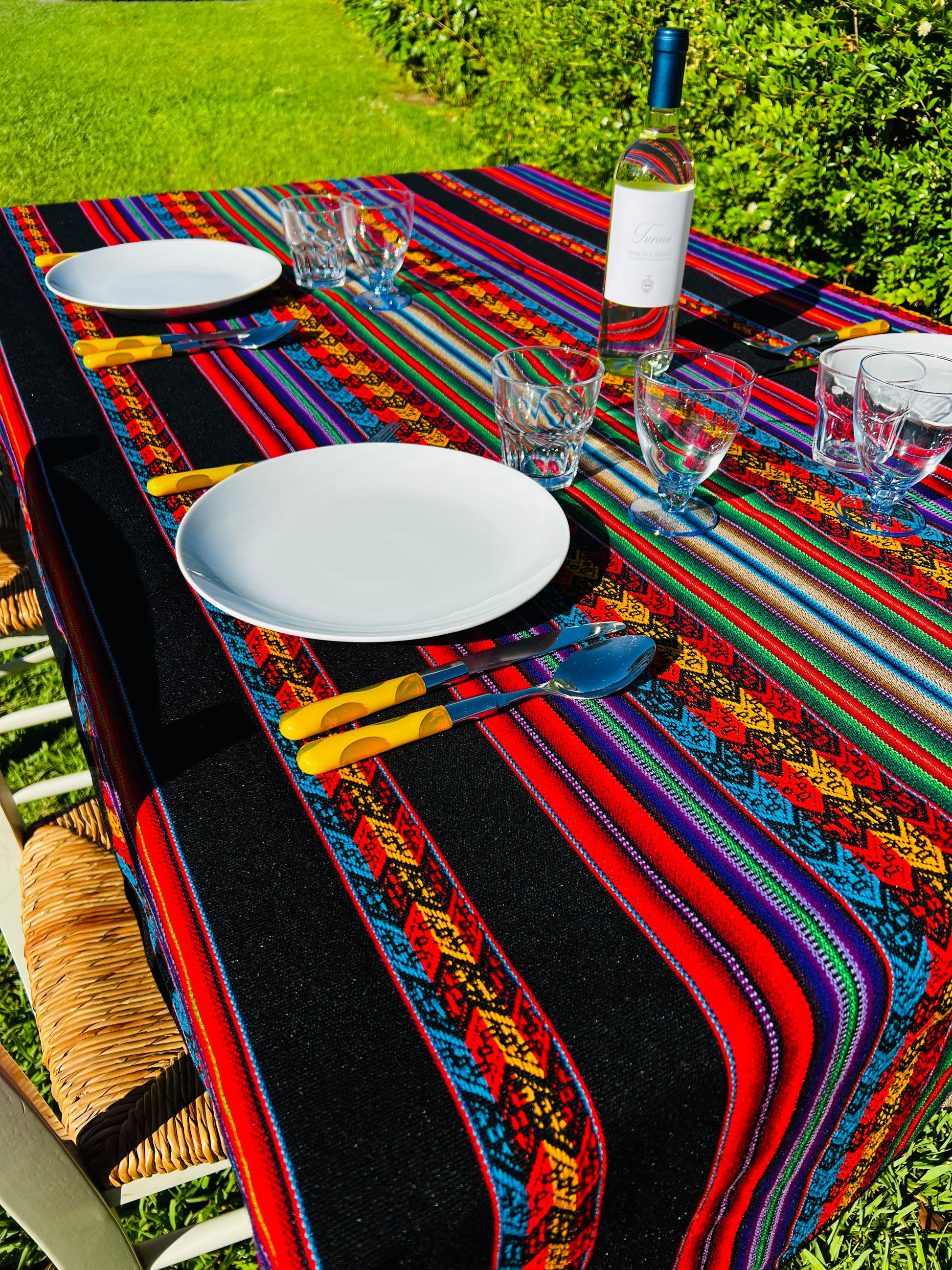 Ideal für ein Festmahl! Hier ist unsere wunderschöne farbenfrohe Tischdecke mit bunten Linienmustern. Die edle schwarze Tischdecke wird Ihr Essbereich fröhlich hervorheben und ein Hingucker für Ihre Gäste sein.